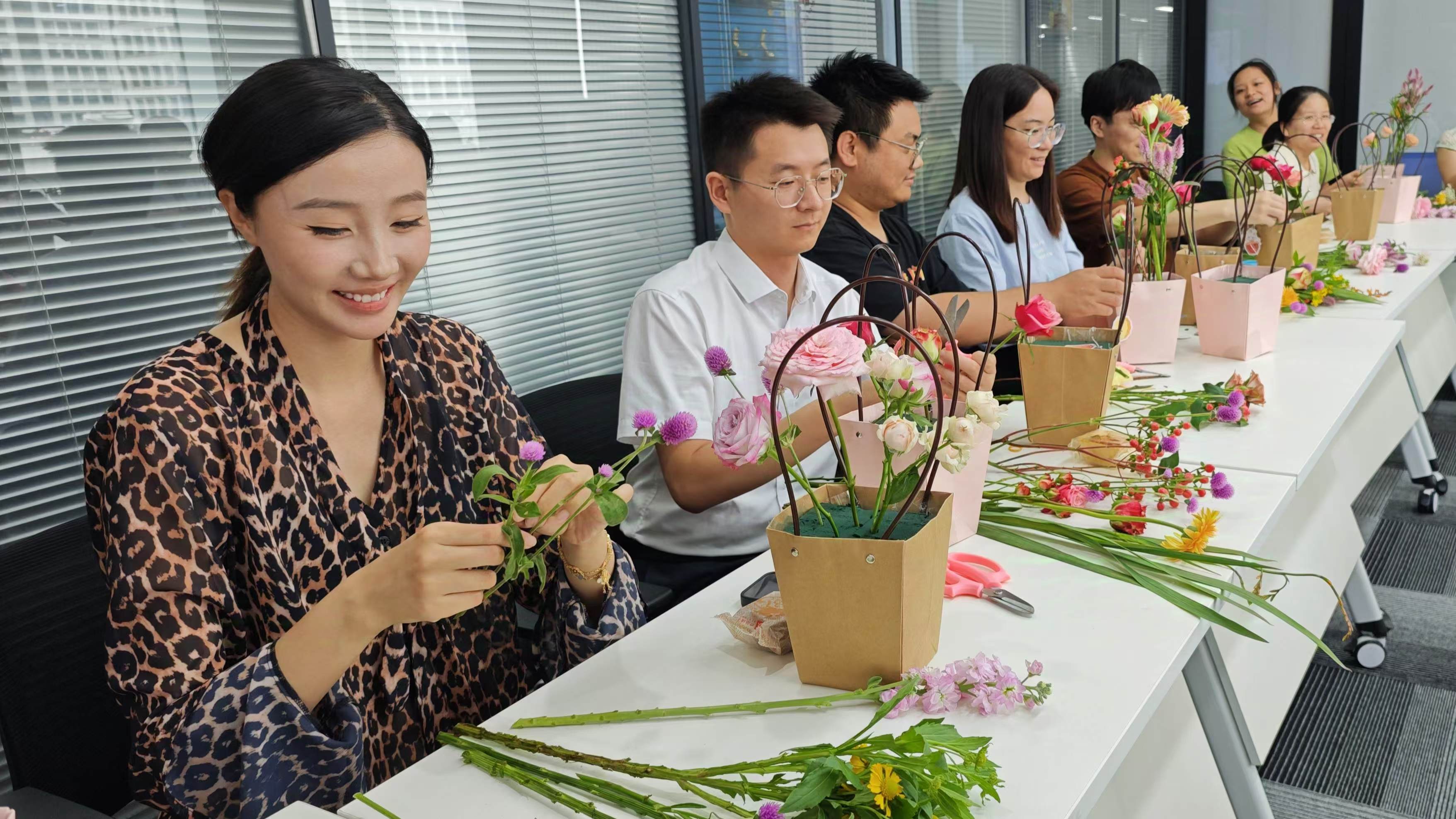 通過一個多小時的創(chuàng)作,大家一件件精美的插花作品逐一呈現(xiàn)。這些作品不僅展現(xiàn)了各位麗源人的巧思與技藝,更傳遞了他們對麗源科技“永旭色彩 持續(xù)未來”理念的內(nèi)心認可?;顒幼詈?,大家手捧作品合影留念,記錄下這一美好瞬間。